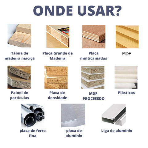 A aplicação se estende a placas de madeira, MDF, liga de alumínio com a possibilidade de uso de lubrificantes de perfuração. Ainda atua em placa plástica, PVC, acrílico e afins.